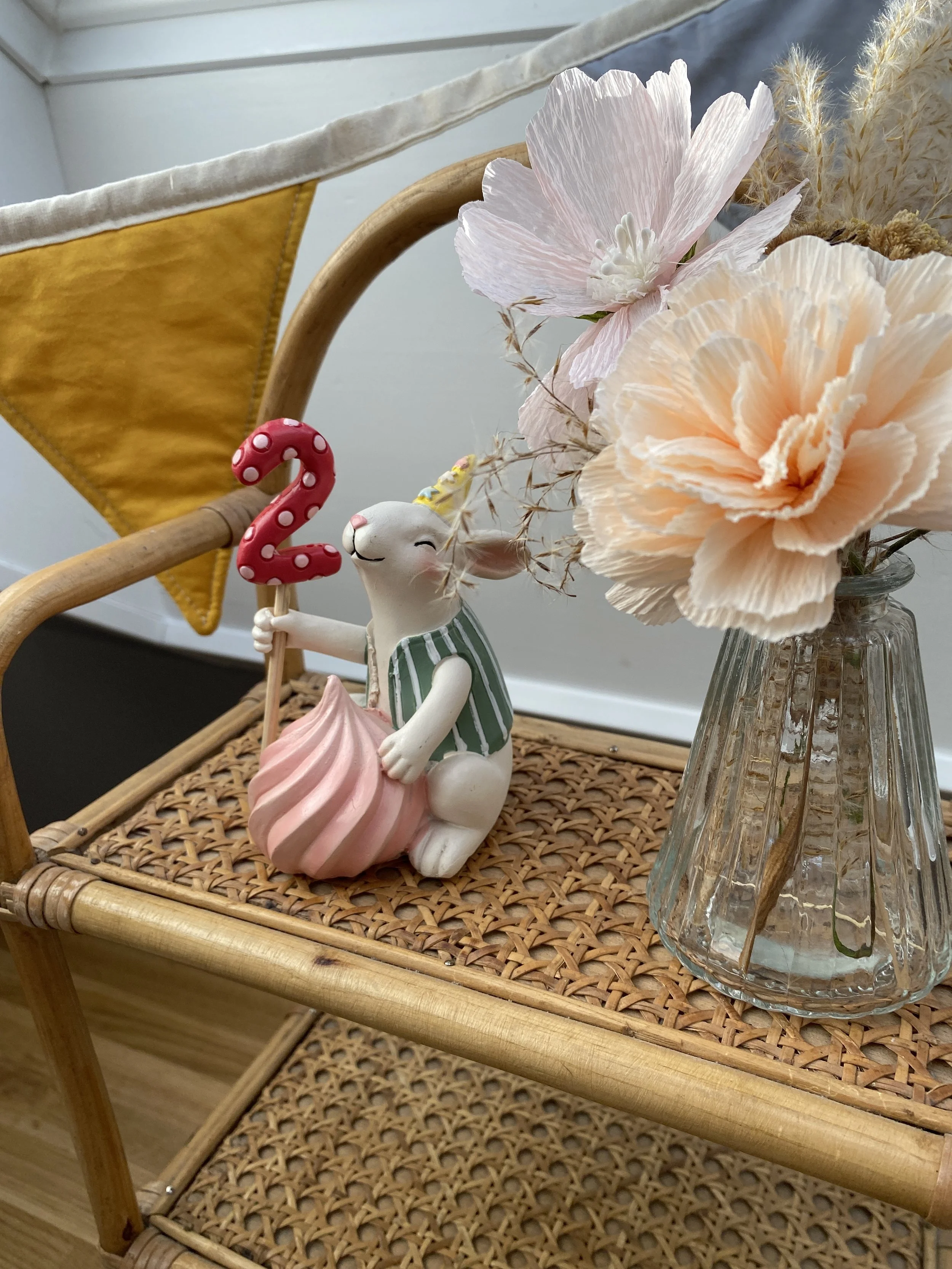 3 große Blumen aus Krepppapier mit Befestigung an verschiedenen Stellen der Mini-Bar